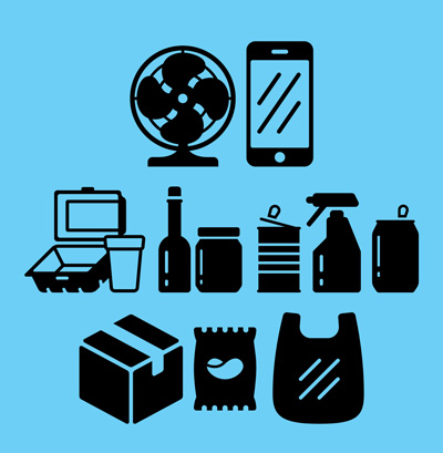 - Refundable beverage containers (aluminum, plastic, drink boxes, gable top, glass, bi-metal, pouch, milk cartons, etc.)